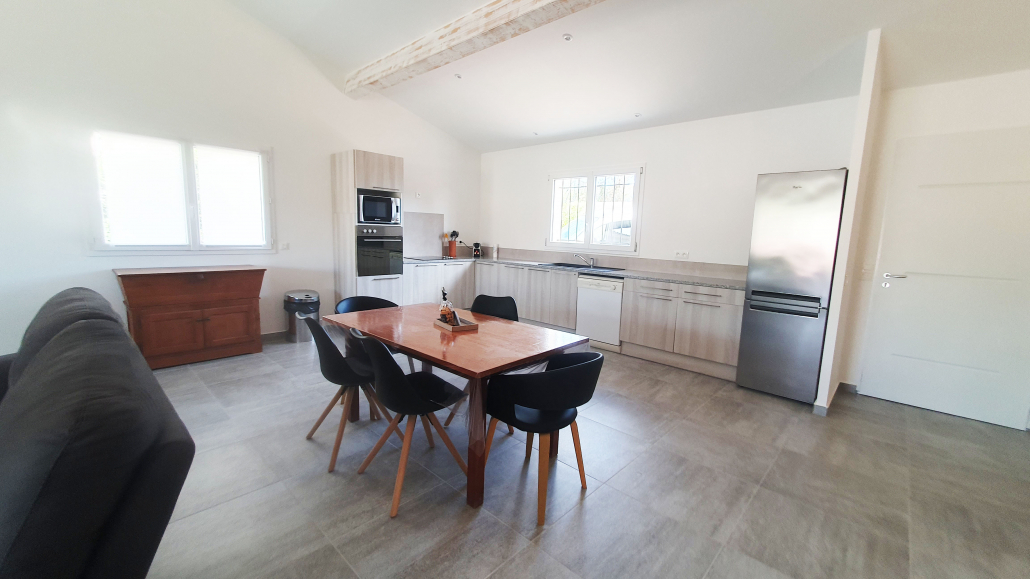 - une cuisine américaine entièrement équipée : réfrigérateur/congélateur, four, lave- vaisselle, plaque de cuisson, micro-onde, cafetière nespresso.